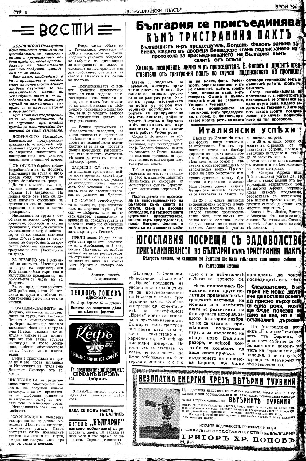 Заглавие: България се присъединява към тристранния пакт : Българският министър-председател, Богдан Филов, замина за Виена, където в двореца Белведера стана подписването на протокола |