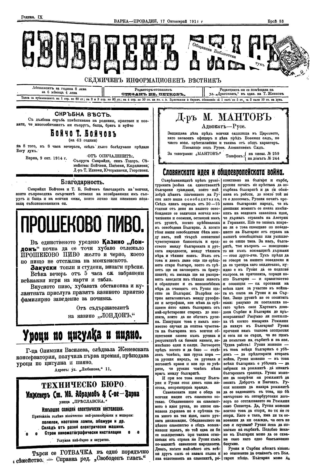 | Дата: | | 17/10/1914, | No. 53 | 1-2 с. | [ виж броя] |