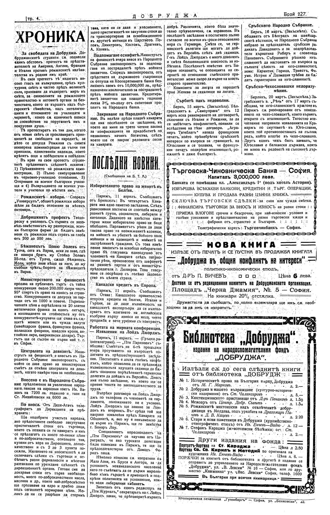 | Съдържа: | * Избирателното право на жените в Белгия. * Канадски кредит в Европа. * Работата на Мирната конференция - изявленията на Лойд Джордж. * Сърбите пак недоволни. * Сръбското народно събрание. * Сръбско-чехословашки недоразумения. |