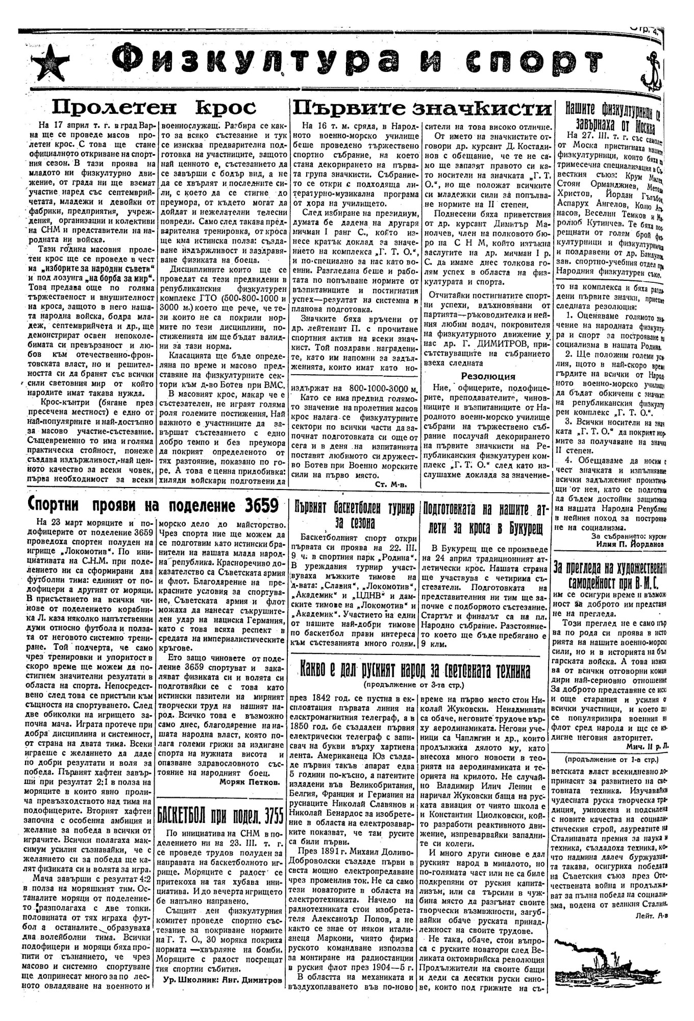 Пролетен крос.(Физкултура и спорт). // Народен флот (Варна), V, No 64, 01/04/1949, с. 4.Одесос, Сталин Подпис: Ст. М-в.