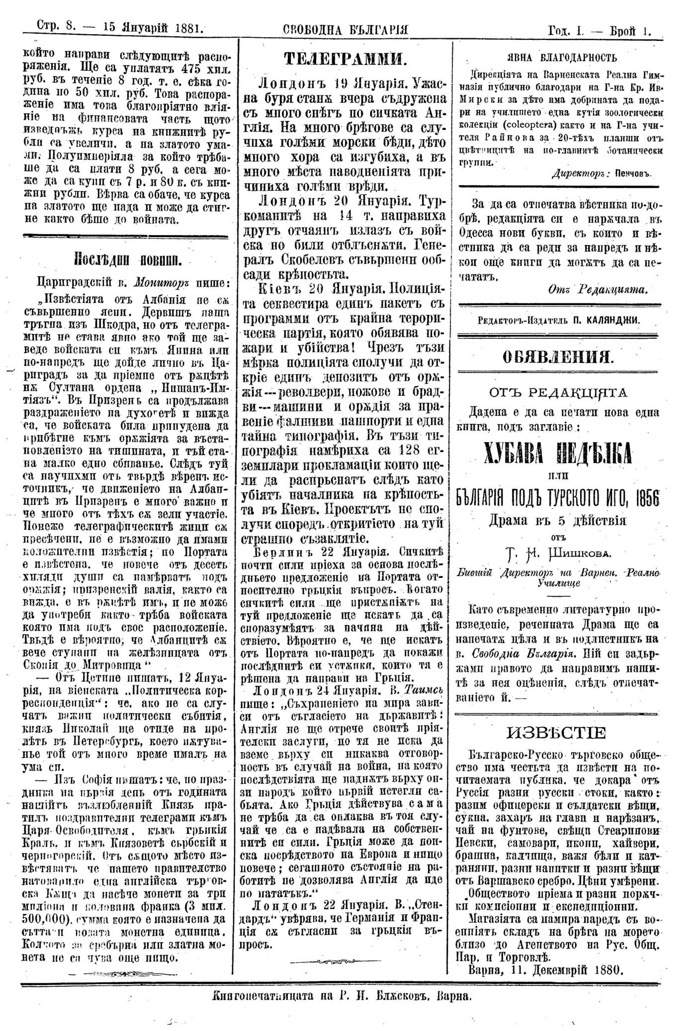 Явна благодарност / Кръстьо Мирски. // Свободна България (Варна), I, No 1, 15/01/1881, с. 8.Одесос, Сталин Дирекцията на Варненската реална гимназия благодари на Кръстьо Мирски за дарената зоологическа колекция.