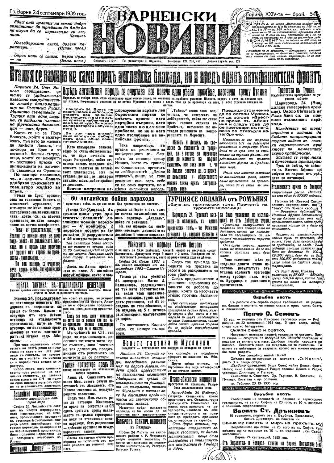 Тревогата в Турция : Малоазиатското крайбрежие се укрепява набързо. // Варненски новини (Варна,печ. Взаимност), XXIV, No 5416, 24/09/1935, с. 1. Италиански параходи около бреговете на Мала Азия.
